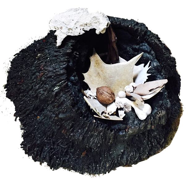 Native mahogany bench fits the 10′ diameter. Rotted palm stump transformed into cast bronze vessel to hold tidal and hammock findings.